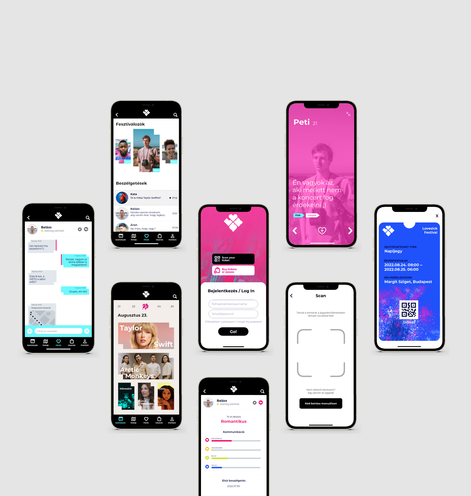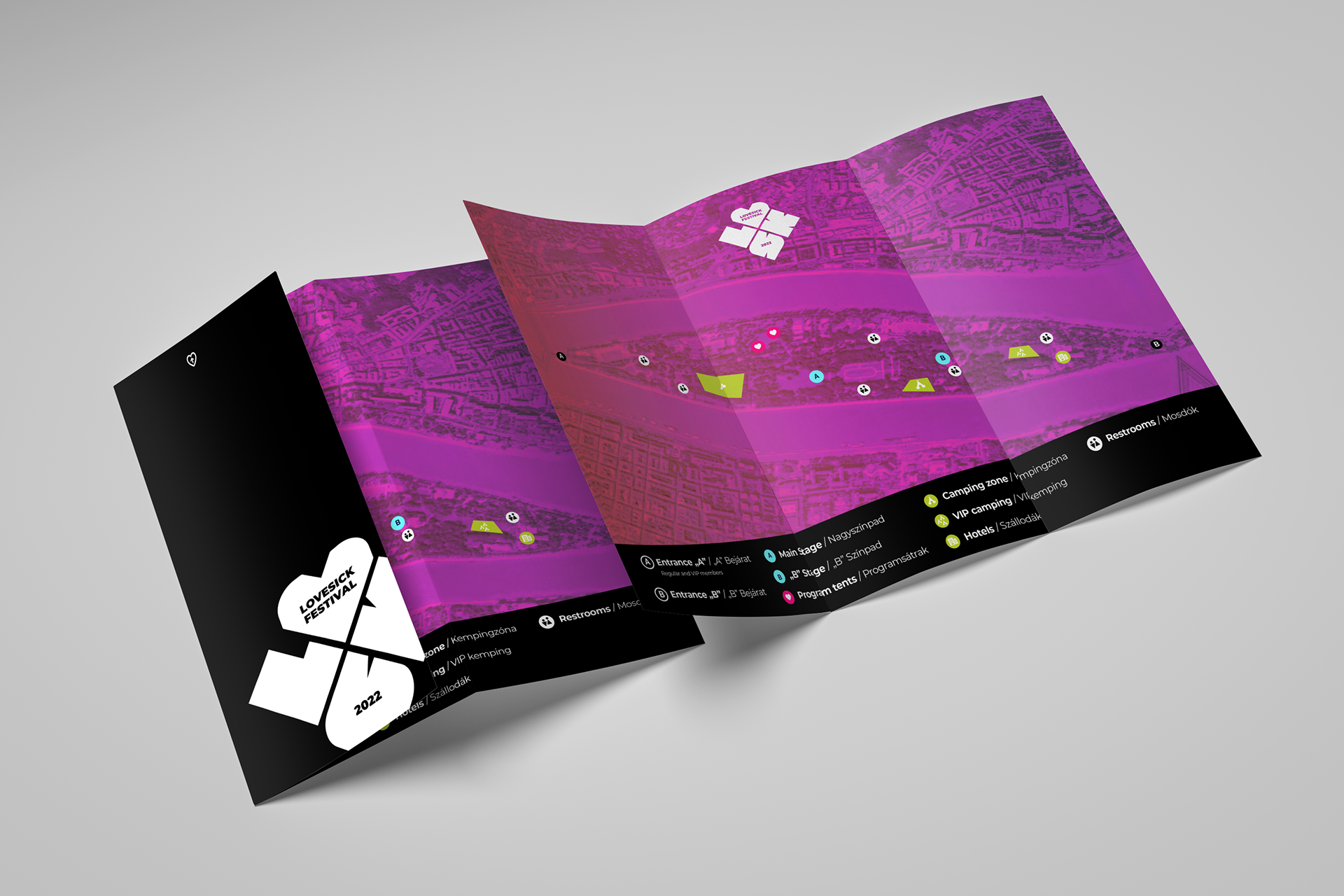 As a Bachelor diploma project at the Budapest Metropolitan University, I designed a brand from scratch that bridges the gap between live music events and dating apps. Using music as a bonding force, Lovesick Festival means to bring people together.